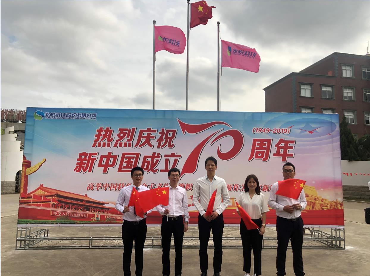 9月30日上午,微風(fēng)徐徐,紅旗飄揚(yáng),一首《我和我的祖國(guó)》在耳邊回蕩。永悅科技股份有限公司在廠員工在公司全體高管的帶領(lǐng)下,正裝整齊,精神飽滿,舉行升旗儀式,喜迎祖國(guó)70周年慶。